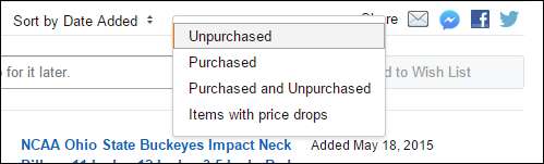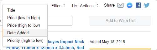 Her er de sorteringsalternativene, som lar deg se ønskelisteelementene dine etter tittel, pris, dato lagt til og prioritet.