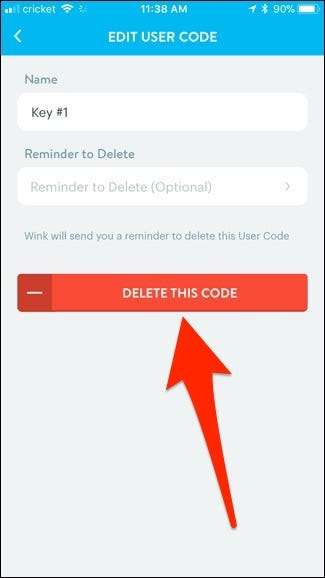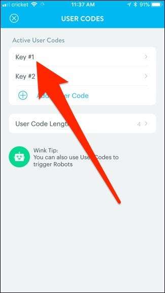 For å slette en brukerkode på telefonen, trykk på pilen til høyre for å få tilgang til låsens brukerkoder. Derfra trykker du på brukerkoden du vil slette.