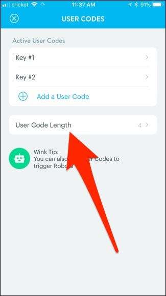 For å endre brukerkodelengden på telefonen, trykk på pilen til høyre for å få tilgang til låsens brukerkoder og velg "Brukerkodelengde".