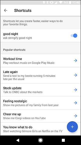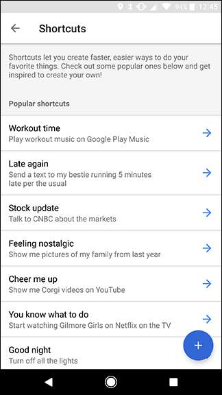 Du ser en liste over foreslåtte snarveier som du automatisk kan aktivere eller tilpasse. Alternativt kan du trykke på det blå plussikonet nederst på skjermen for å opprette du er på. Vi gjør det siste for vårt eksempel.