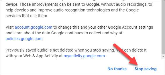En melding vil åpne og forklare hva som skjer hvis du slutter å lagre lydopptak. Klikk på "Stopp lagret" hvis du er sikker.