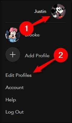 For å starte, hold musen over avataren øverst til høyre og klikk deretter på "Rediger profiler" -knappen.