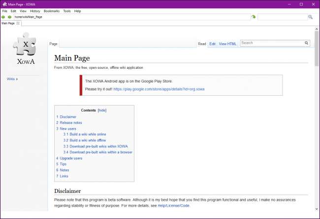 Når XOWA er installert og kjører, åpnes det i sin egen spesielle frakoblede wiki-applikasjon, som ligner på hvilken som helst nettleser du vanligvis bruker.