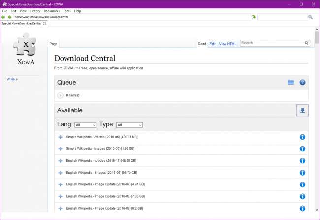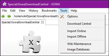 Fra og med versjon 9.6.3 har XOWA en enkel, strømlinjeformet nedlastingsside som tar gjetningen ut av nedlasting av wikier. For å få tilgang til denne siden som heter "Last ned sentralt", klikk på "Verktøy" -menyen og velg den.