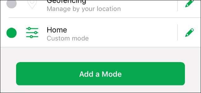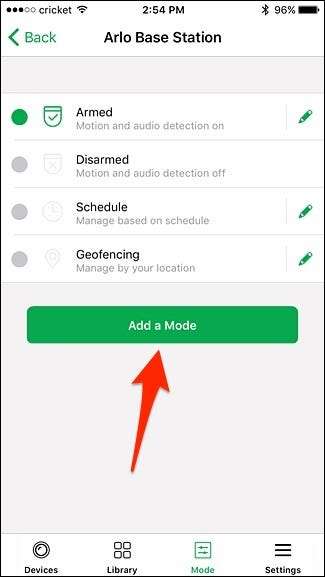 Det er fire standardmodi tilgjengelige: Bevæpnet, Frakoblet, Tidsplan og Geofencing. Dessverre tillater ingen av disse modusene kameraet å ta opp bevegelse uten å motta varsler hele tiden. Du kan redigere standardmodusene for å gjøre dette, men det kan være lurt å enkelt bytte frem og tilbake mellom å motta varsler og ikke motta dem. Det er her du kan lage din egen tilpassede modus.
