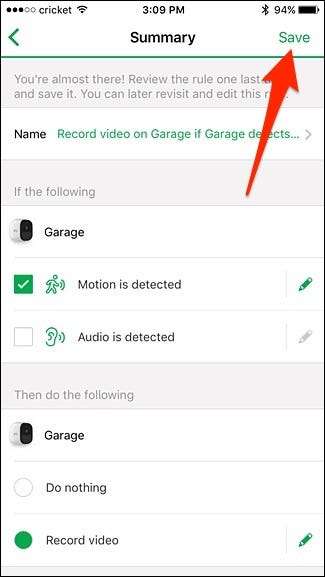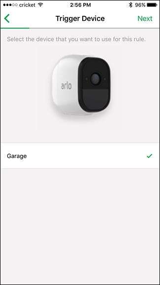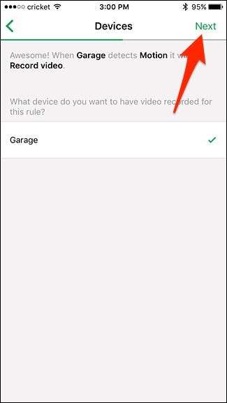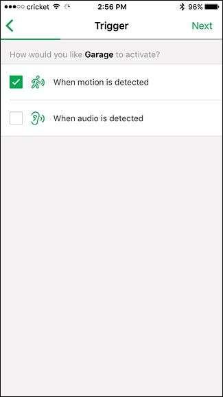 På neste skjermbilde velger du hvordan du vil at kameraet / kameraene skal aktiveres, enten å velge “Når bevegelse blir oppdaget” eller “Når lyd blir oppdaget”. Du kan også velge begge.