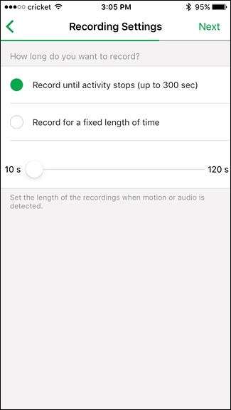 Deretter velger du hvor lenge du vil at kameraet / kameraene skal ta opp, enten å ta opp til bevegelsen stopper eller ta opp i en fast tid. Trykk på "Neste".