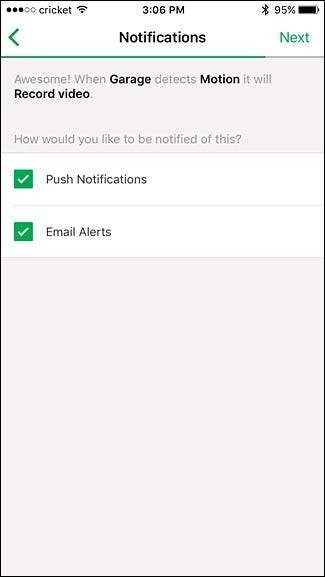 På det neste skjermbildet velger du hva du vil at kameraet (e) skal gjøre, samt om du vil at sirenen skal høres eller ikke. Trykk på "Neste".
