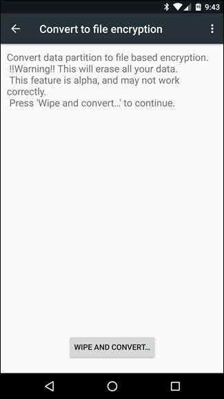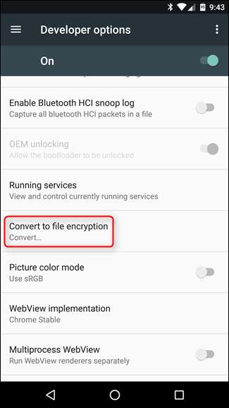 Hvis du vil konvertere til filbasert kryptering, kan du gjøre det ved å aktivere utvikleralternativer , deretter går du inn i utvikleralternativer og trykker på "Covert to file encryption" -alternativet. Husk at dette vil slette alle dataene dine, og tilbakestille enheten effektivt!