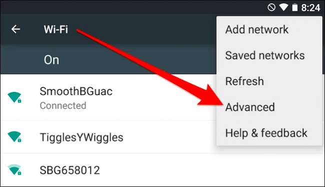 Det er en annen måte som er litt mer fordelaktig fordi den slår W-iFi av og på for deg. Åpne Wi-Fi-innstillingene i Android (vi viser skjermene fra Lollipop, men de er de samme på Kit Kat), og klikk deretter på "Avansert".