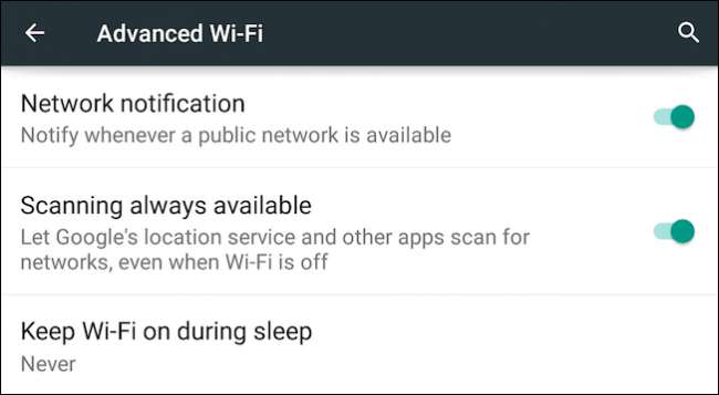 På skjermbildet Avansert, vær oppmerksom på at det er en innstilling for å "holde Wi-Fi på under søvn." Endre dette til “Aldri”, og Wi-Fi slås automatisk av når enheten går i hvilemodus.
