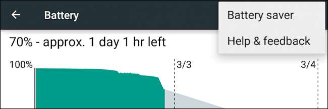 Fra og med Android 5 la Google til en batterisparefunksjon, som vil redusere Androids energifotavtrykk ytterligere. Mens du er i batteriinnstillingene, vil du trykke på de tre punktene i øvre høyre hjørne og velge "batterisparing".