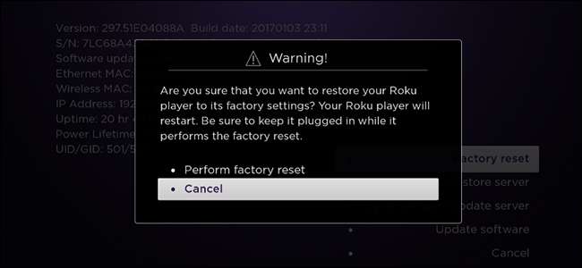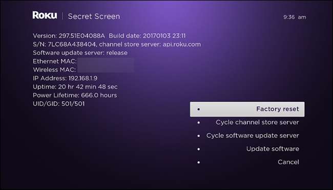 Dette vil starte den hemmelige skjermen, som tilbyr all slags informasjon om din Roku, samt et tilbakestillingsalternativ for fabrikk.