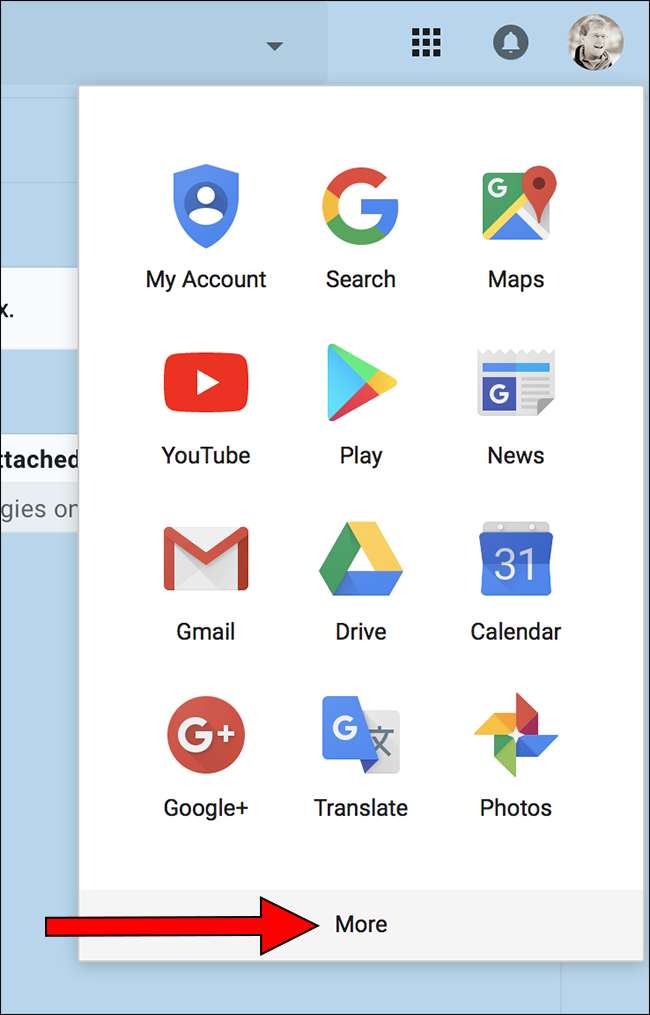 Klikk på den, så ser du en rekke ikoner for forskjellige Google-applikasjoner. Hvis kontaktene ikke er der, klikker du på «Mer» -knappen nederst.