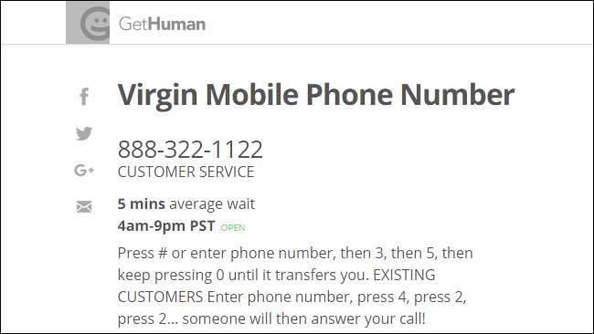 Hvis du prøver å motta kundesupport fra et menneske —Spesielt når du arbeider med en enorm, ansiktsløs megakorporasjon, kan det være lurt å hoppe over alt det råd og bruk GetHuman.com . Den gir en database med de beste telefonnumrene for samtaler for ulike kundestøtteproblemer for bedrifter, komplett med et estimat på hvor lenge du venter på linjen. Enda bedre, det gir telefontrær som viser deg den raskeste måten å komme deg gjennom det automatiserte systemet og nå en person som faktisk kan forstå og løse problemet ditt.