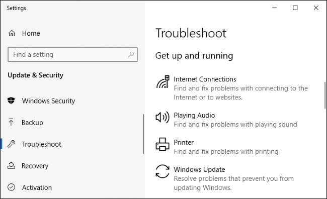 Hvis du opplever et problem, Windows 10s innebygde feilsøkingsprogrammer kan være i stand til å hjelpe. For å finne dem, gå til Innstillinger> Oppdatering og sikkerhet> Feilsøking. Eller søk etter "Feilsøk" i Start-menyen og velg "Feilsøk innstillinger."
