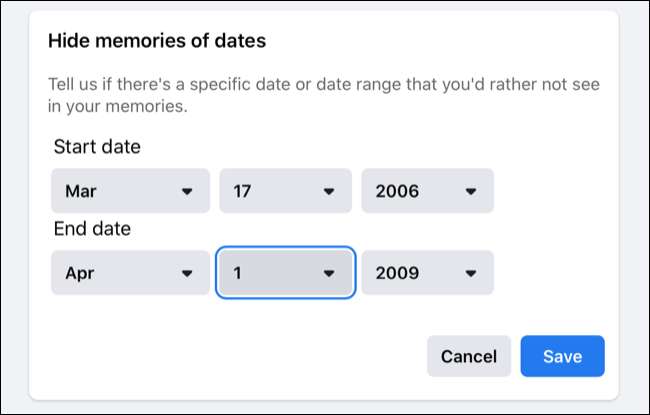 Klikk på "Skjul datoer" og klikk deretter på "Legg til nytt datoperiode" for å angi en start- og sluttdato for å ekskludere minner. Du kan effektivt slå av Facebook-minner ved svarteliste hele datoområdet i denne menyen. [1. 3]