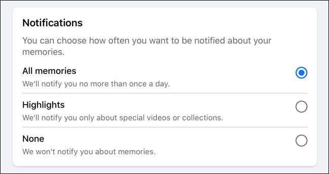 For å gjøre dette på mobilen, trykk på "Mer" -fanen (det ser ut som tre horisontale linjer) og velg "Memories" og trykk deretter på COG-ikonet øverst til høyre. Du kan nå velge "Ingen" for å fjerne disse varslene helt. [1. 3]