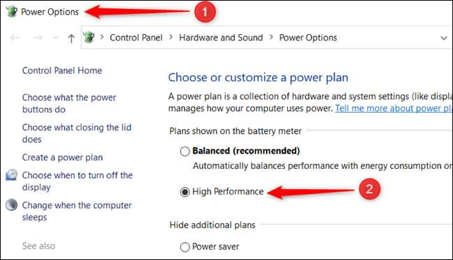 Fra vinduet Power Options velger du alternativet "High Performance" for å gi den bærbare datamaskinen et løft for å kjøre applikasjoner. [1. 3]