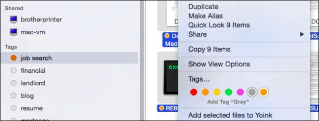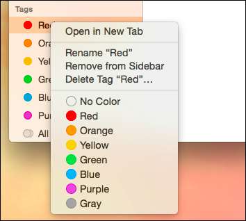 Disse standardkodene kan enkelt endres. Høyreklikk på en hvilken som helst, og du kan gi nytt navn eller slette den, fjerne den fra sidefeltet, endre fargen eller åpne den i en ny Finder-fane. Dermed, hvis du har en haug med filer merket "Rød", kan du klikke på dem for å se dem i Finder-vinduet, eller i en ny fane.