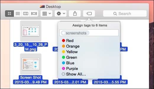 Vi skal velge filene, seks i alt, og klikke på Tagger-knappen på Finder-verktøylinjen. Herfra vises en meny. Det er alle standardkodene. For å legge til en "skjermbilder" -kode, skriver vi den inn og trykker "Enter".