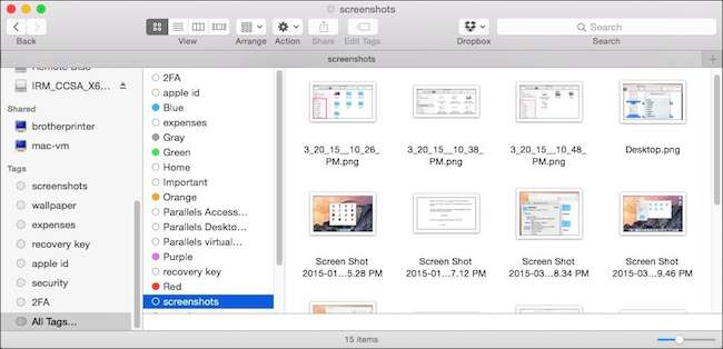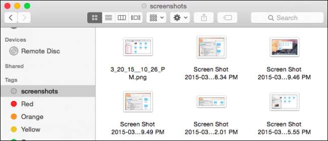 Vi har lagt til taggen "skjermbilder" til disse seks bildene, som er lagret i filens metadata, så selv om du overfører dem til en annen mappe, stasjon eller til og med en annen Mac, kan du fremdeles finne disse filene med "skjermbilder " stikkord.
