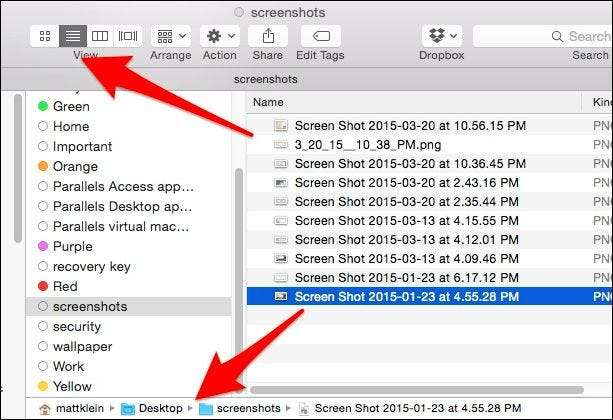 Den forrige ikonvisningen gir oss små detaljer om hvor disse filene alle ligger, men vi kan endre visningen , og få en nøyaktig ide om hvor de er i Finder.