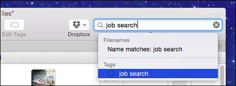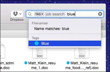 Vi demonstrerer først ved hjelp av Spotlight . Du kan strenge flere koder sammen til ett søk. Denne vil liste opp alle våre "jobbsøk" -filer med den "blå" koden. Ved å bruke disse to kodene sammen sikrer vi at vi bare ser filer som samsvarer med dette kriteriet kontra alle "jobbsøk" -koder eller alle "blå" koder.