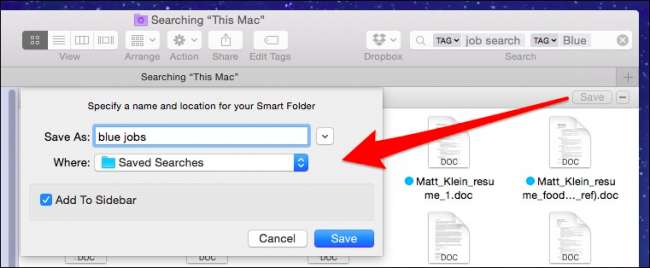 Det er også mulig å lage slike søk og lagre dem til senere. Lagrede søk kan navngis og lagres hvor du vil. Du kan også legge dem til i sidefeltet for enkel tilgang.