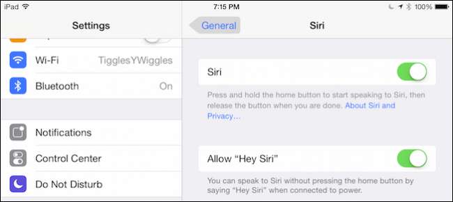 Siri har ikke mange alternativer å håndtere. Først og fremst er det et alternativ å slå henne helt av, og under det er "Tillat 'Hey Siri'" -bryteren.