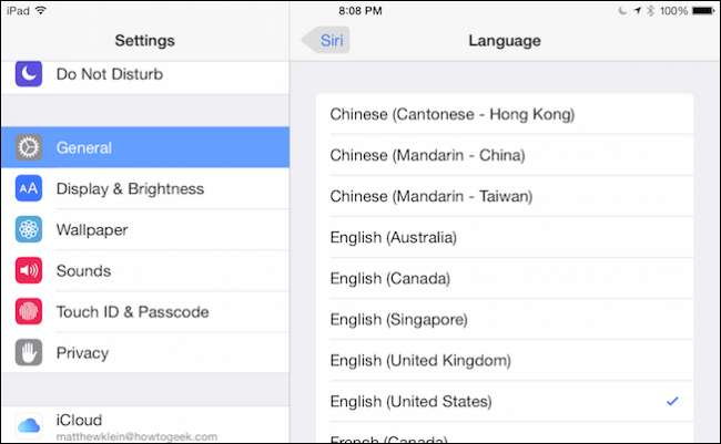 Siri er også en seriøs polyglot. Hvis du trykker på "Språk" -knappen, ser du et bredt og omfattende utvalg av forskjellige språk, ofte i flere varianter.