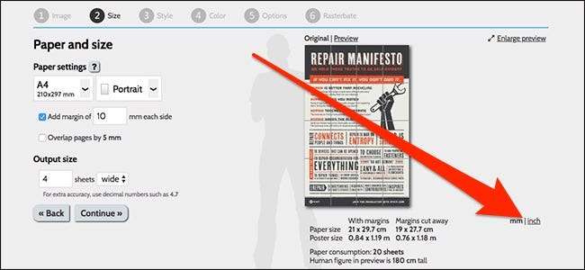 På høyre side får du en forhåndsvisning av veggmaleriet ditt med dimensjoner på hvor stor plakatstørrelsen vil vise seg, samt hvor mange papirark som skal brukes. I dette eksemplet lager jeg bare plakaten omtrent to meter bred og tre meter høy, men du kan gjøre din så stor du vil. Trykk på "Fortsett" for å gå videre til neste trinn.