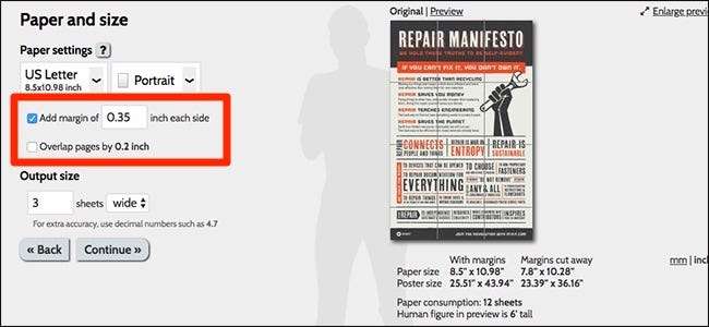 Etter det kan du legge til marginer (og justere størrelsen), samt legge til en overlapping. Margen styrer størrelsen på den tomme kanten på hver flis. Margen lar deg legge fliser på hverandre for å lime eller tape dem sammen. Legge til en overlappingsutskrift litt ekstra fra den forrige flisen, slik at du kan stille dem opp uten risiko for at den tomme rammen kikker gjennom. Begge disse alternativene er en personlig preferanse, men jeg anbefaler i det minste å legge til marginer for å gjøre det lettere å sette alle flisene sammen når monteringstid.