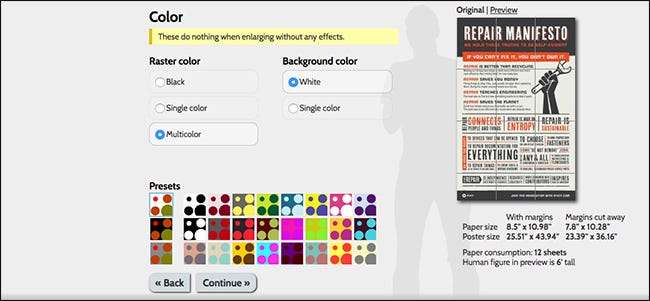 Den neste skjermen lar deg velge farger hvis du valgte å gå med halvtoning, men siden jeg valgte ingen effekter i dette eksemplet, trenger jeg ikke å bry meg med disse. Trykk på "Fortsett" for å gå videre.
