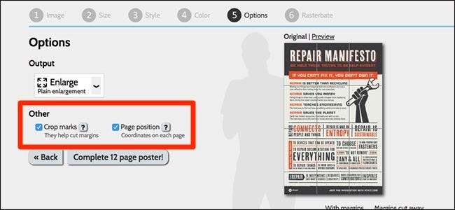 Under delen "Annet" kan du inkludere beskjæringsmerker (som gjør det lettere å stille opp flisene) og sideposisjoner, som plasserer et lite tall i hjørnet av hver flis for å fortelle deg hvor de går. Begge disse er nyttige under montering.