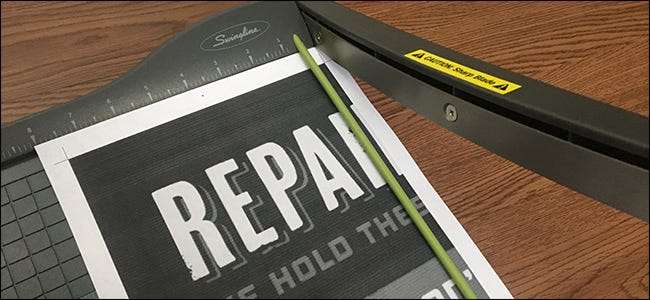 Deretter må du kutte bort noen av de tomme kantene slik at du kan stille flisene opp sømløst. Du trenger bare å gjøre dette på visse sider av hvert ark, siden du legger over hverandre mens du går. Saks fungerer bra for dette, men a giljotinpapirkutter anbefales på det sterkeste. Det er også her å sette en "overlapping" kan være nyttig, da du kan kutte av litt mer enn den hvite kanten og fremdeles være i orden.