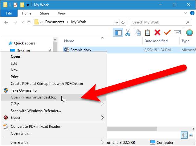 For å åpne en fil eller et program på et nytt virtuelt skrivebord, høyreklikk på filen, programmer. Exe-fil eller programgenvei og velg "Åpne i nytt virtuelt skrivebord" fra popup-menyen.