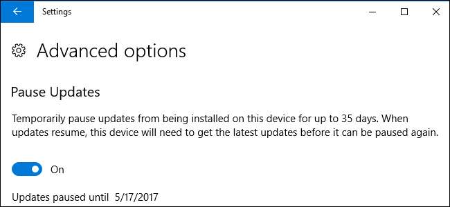 Bare vær oppmerksom på at du bare ser dette alternativet hvis du bruker Windows 10 Professional , Enterprise eller Education, og til og med bare hvis du har gjort det installerte Creators Update . Pauser oppdateringer er ikke tilgjengelig hvis du bruker Windows 10 Home.