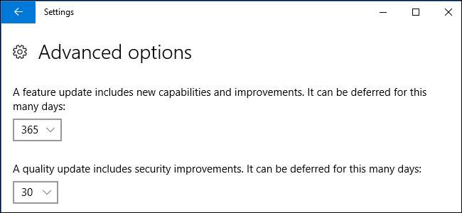 For å utsette oppdateringer, gå til Innstillinger> Oppdatering og sikkerhet> Windows Update> Avanserte alternativer. Rull ned og bruk alternativene "Funksjonsoppdatering" og "Kvalitetsoppdatering" under "Velg når oppdateringer skal installeres" for å spesifisere hvor mange dager du vil utsette oppdateringer for. Sett disse alternativene tilbake til “0” for å stoppe utsettelse av oppdateringer.