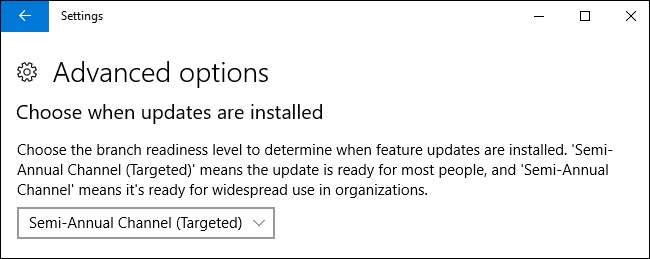 Det andre alternativet du har i dette vinduet er grenenes beredskapsnivå for å motta funksjonsoppdateringer. "Current Branch" får oppdateringer når Microsoft anser at funksjonene er klare til generell bruk. "Current Branch for Business" får oppdateringer av funksjonen saktere, og bare når Microsoft føler at de er klare for distribusjon av bedrifter. Hvis du ønsker å få funksjonsoppdateringer tidligere, velger du "Gjeldende gren". Hvis du vil utsette nye funksjoner så lenge som mulig, velger du "Nåværende filial for virksomheten".