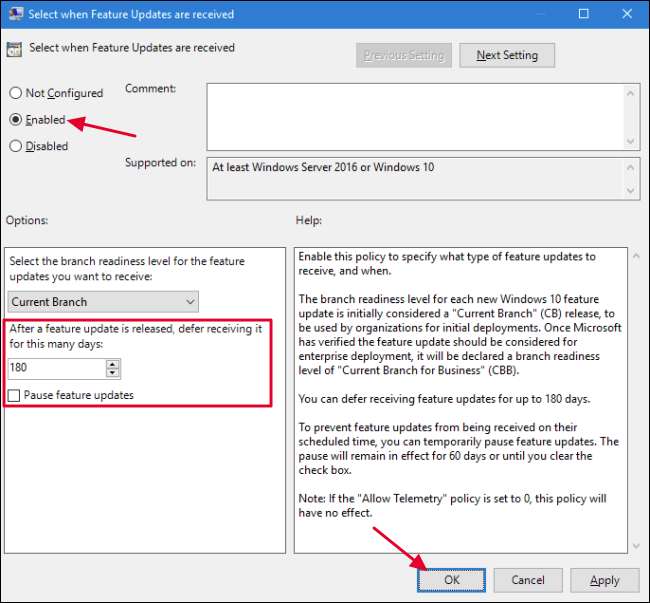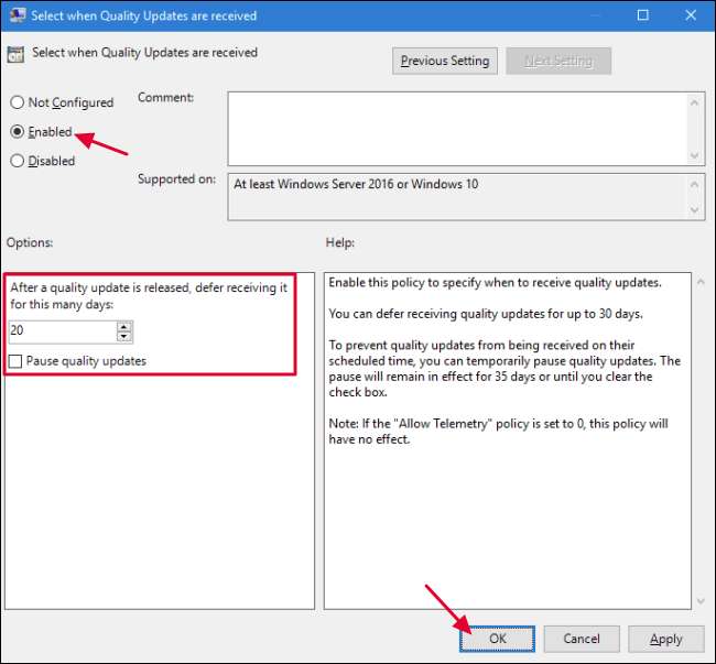 I eiendomsvinduet velger du alternativet "Aktivert". Vær oppmerksom på at det ikke er noe valg for filialvalg for kvalitetsoppdateringer. Du kan angi antall dager for å utsette oppdateringer hvor som helst opptil 30 dager. Å bruke pausefunksjonen er igjen akkurat som å bruke utsettelsesalternativet i Windows Update-grensesnittet. Det vil stoppe oppdateringene i 35 dager eller til du kommer tilbake og fjerner merket for alternativet. Når du er ferdig med å sette inn alternativer, klikker du på "OK".