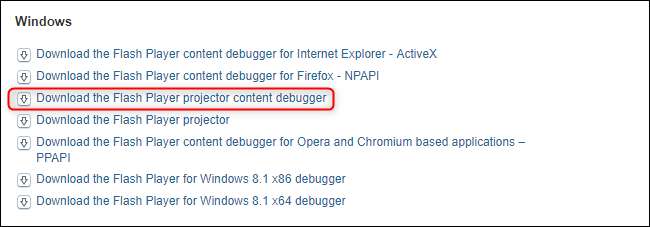 For å få det, besøk Feilsøk siden for nedlastinger på Adobes Flash Player-nettsted. Klikk på "Last ned Flash Player-innholdsfeilsøkingsprogrammet for projektorer" under Windows, Mac eller Linux, avhengig av hvilket operativsystem du bruker.