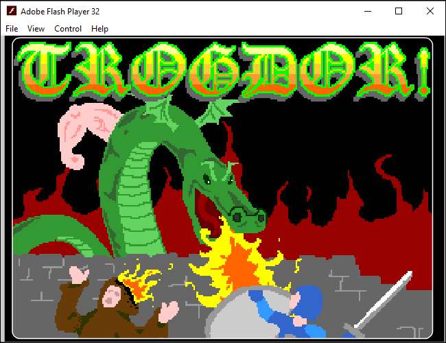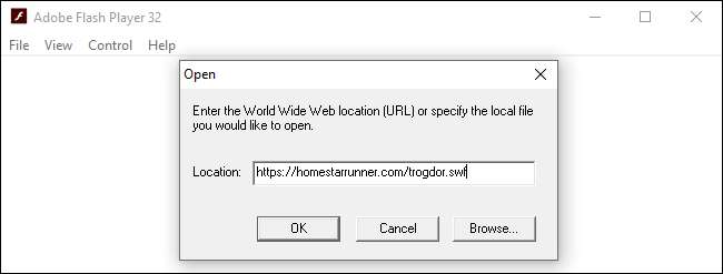 Du får et enkelt Adobe Flash Player-vindu. For å åpne en SWF-fil, dra og slipp den til vinduet eller klikk på Fil> Åpne. Du kan bla til en SWF-fil på det lokale systemet eller angi en sti til en SWF-fil på nettet.