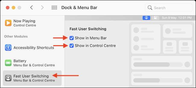 I venstre sidefelt, bla ned og velg "Rask brukerbryter." Klikk på merket ved siden av "Vis i menylinjen" eller "Vis i Control Center" for å aktivere de respektive funksjonene.