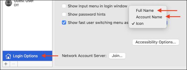 Gå til "Login Options" -delen i sidefeltet, og i alternativet "Vis Fast User Switching Meny AS", velg alternativet "Fullt navn" eller "Kontonavn".