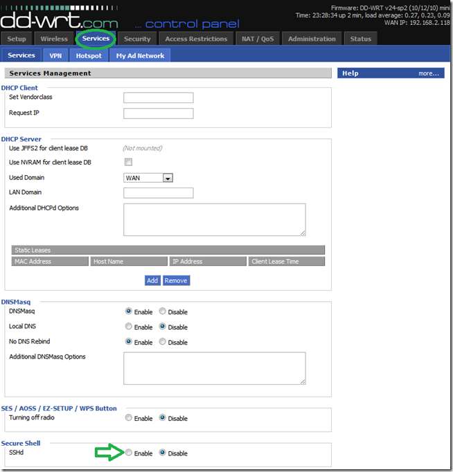 For å gjøre dette, ved hjelp av webGUI, gå til "Tjenester" -fanen. Finn "Secure shell" -delen og klikk på "Aktiver" -knappen for SSHd-innstillingen.