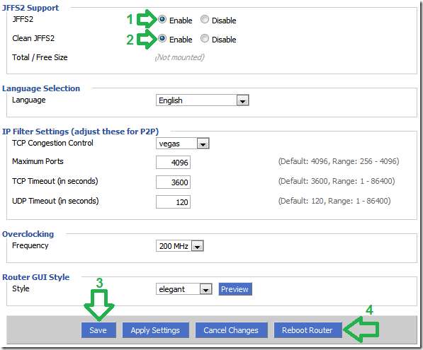 I delen JFFS2 Support klikker du på "Aktiver" -knappene for "JFFS2" og (når den vises) "Rengjør JFFS2" -innstillingene. Når du er valgt, klikker du på “Lagre”.
