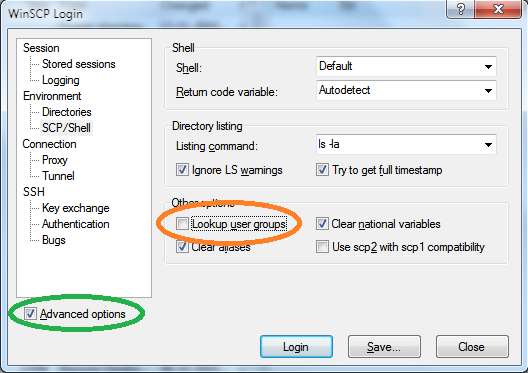 Vi må også deaktivere “Lookup user group” som vist nedenfor (takk mstombs for at du påpeker dette) fordi winSCP forventer en fullverdig Linux på den andre siden som DD-WRTs utviklere, til tross for alt det gode arbeidet, ikke kunne tilby (hovedsakelig fordi det ganske enkelt ikke er nok plass). Hvis du lar dette være avmerket, vil du støte på skumle meldinger når du kobler til og lagrer redigerte filer.