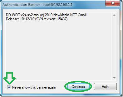 DD-WRTs utviklere har implementert en Banner-velkomstmelding med litt info om fastvaren du har installert. Når du er rød, klikker du på avkrysningsruten “Vis aldri dette banneret igjen” og “Fortsett”.
