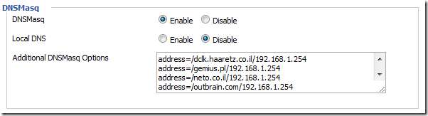 Gå til "Tjenester" -fanen, finn "DNSMasq" -delen og finn deretter tekstfeltet "Ytterligere DNSMasq-alternativer".